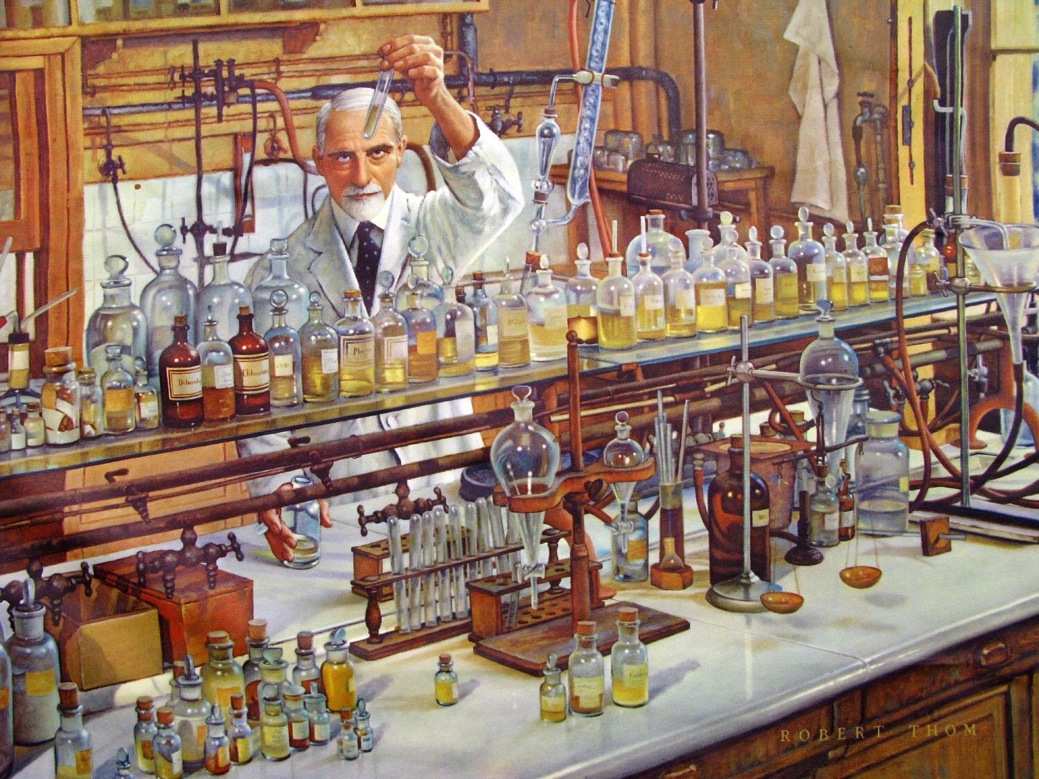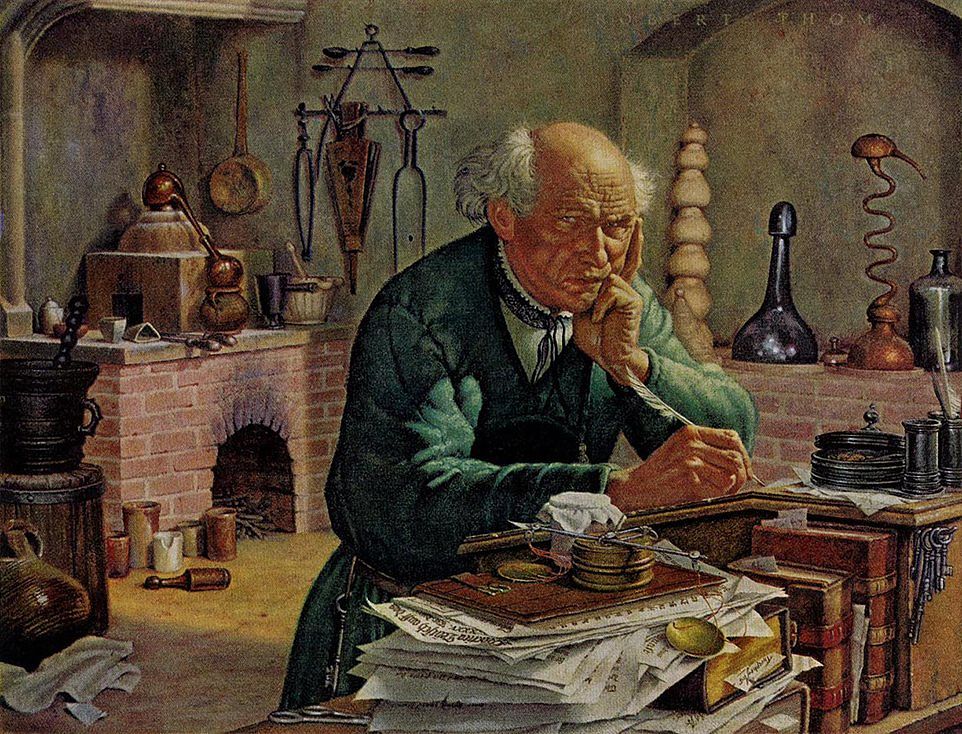 I have a deep admiration for paintings that capture the passion and dedication of early scientists, particularly those that depict their research and laboratories. One of my greatest sources of motivation is knowing that humanity has reached its current level of understanding thanks to the invaluable contributions of them. I'm excited to share a few of my favorite pieces of art here, celebrating the remarkable journey of scientific discovery. (One of my favorite illustrator is Robert A. Thom and his paintings on history of medicine and pharmacy.)